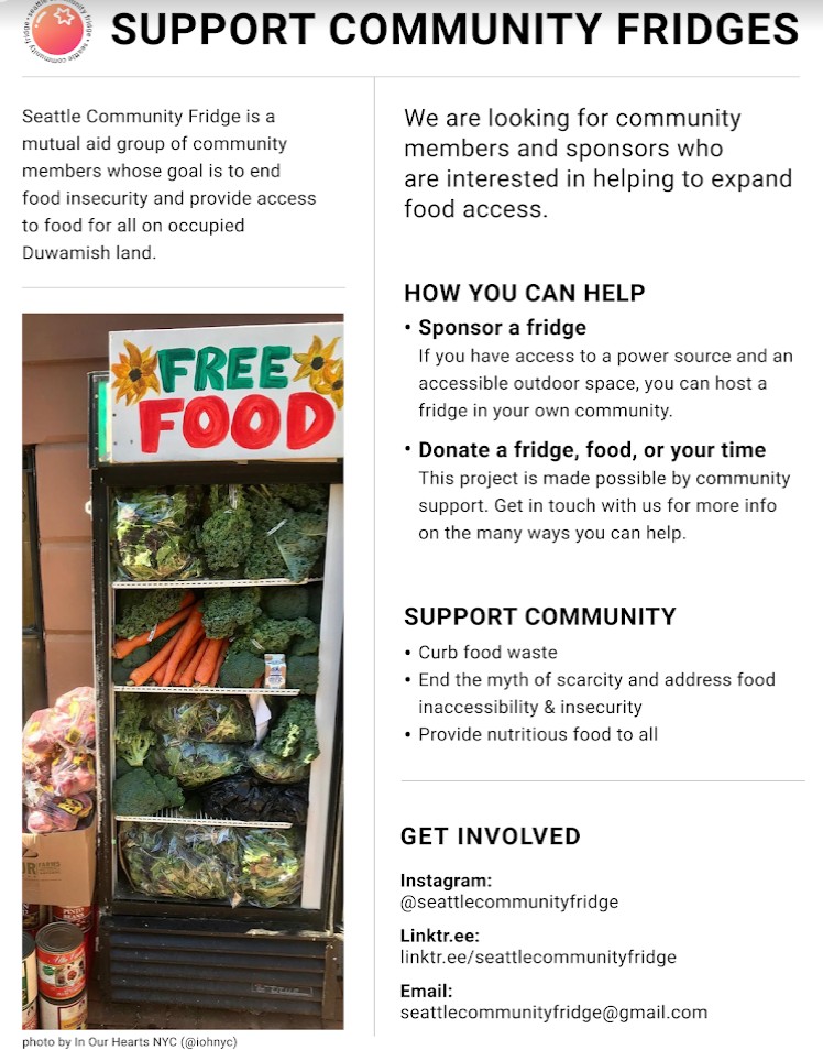 This upcoming Saturday (3/8) I’ll be picking up food from a local food bank to distribute at a few fridges across Seattle. Feel free to come with! It’s a great way to meet community members, while also helping provide free food for our neighbors (and you get to hang with me teeheehee). I’ll also be doing similar runs every first Saturday of the month- if you’re ever interested in joining, please let me know!